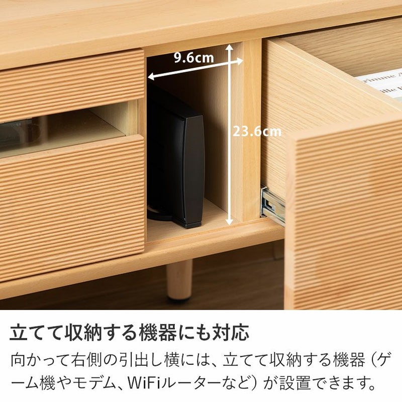 向かって右側の引出し横には、立てて収納する機器(ゲーム機やモデム、WiFiルーターなど)が設置できます。