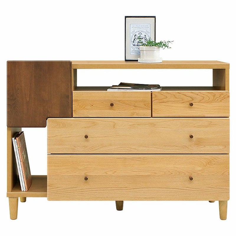 ●個性的なフォルムと遊び心のあるウッド調のグラデーションカラーが特徴的な、木製リビングチェストのワイド幅タイプです。