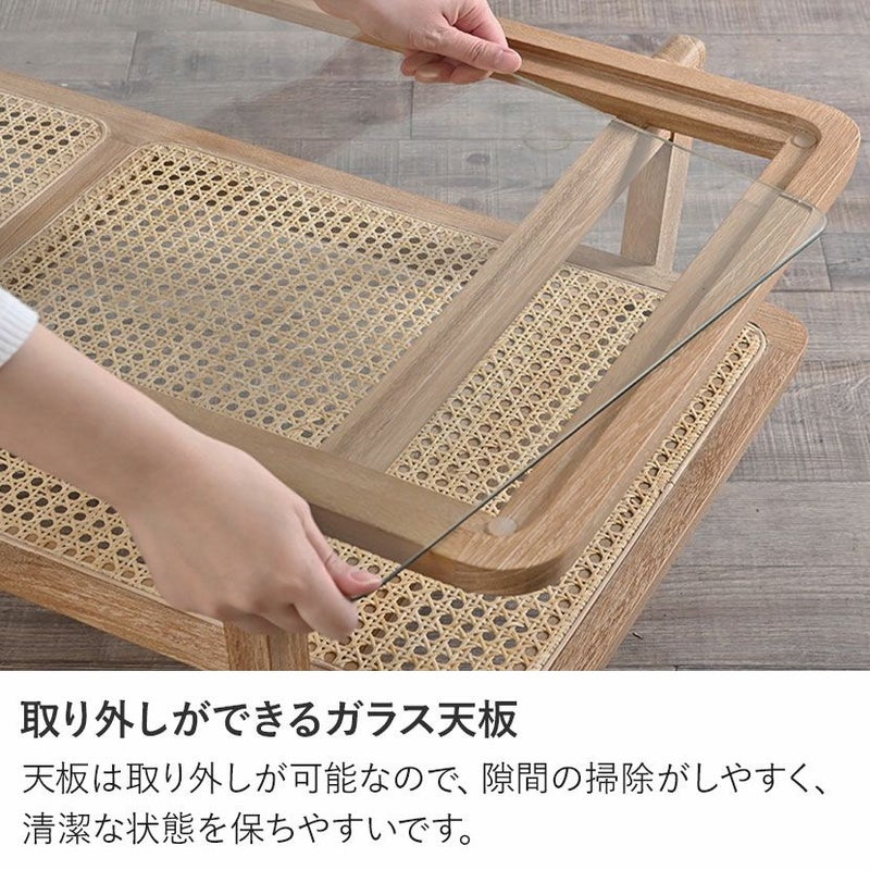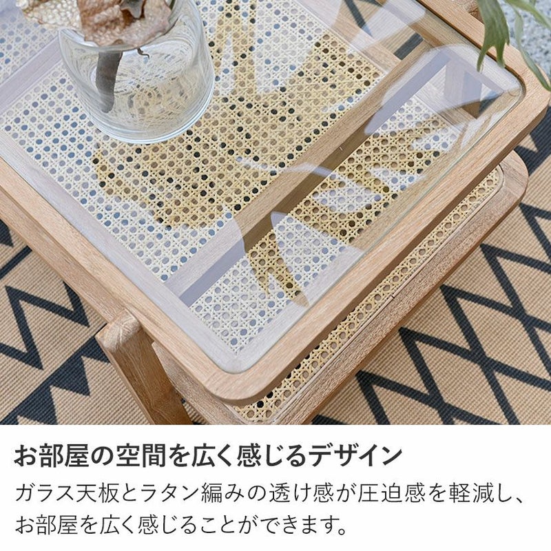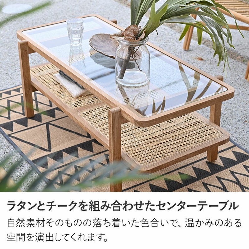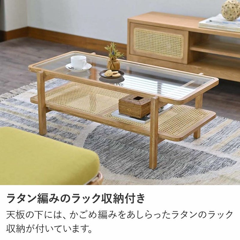幅100cm リビングテーブル CALM 無垢 ラタン 籐 ガラス センターテーブル 棚付き ガラステーブル ラタンテーブル ローテーブル おしゃれ ナチュラル 北欧 韓国 アジアン