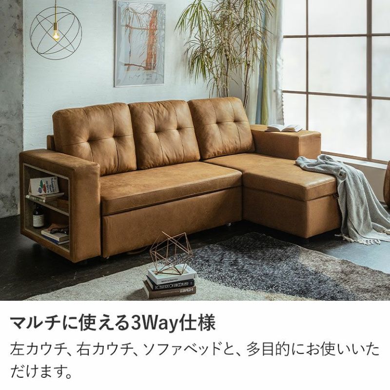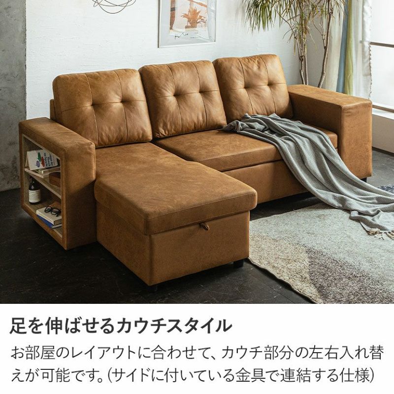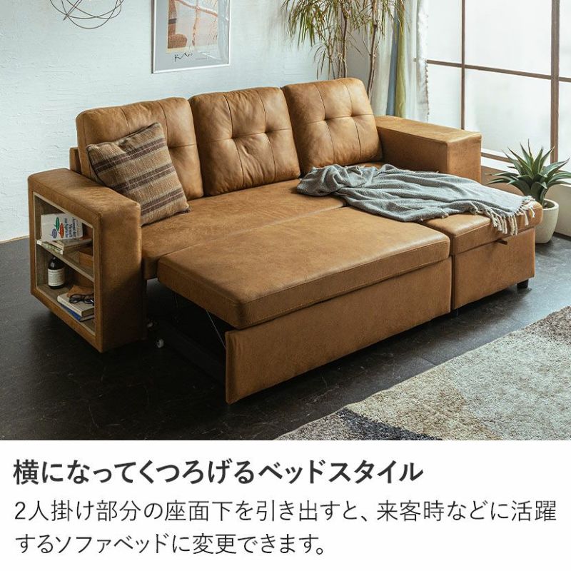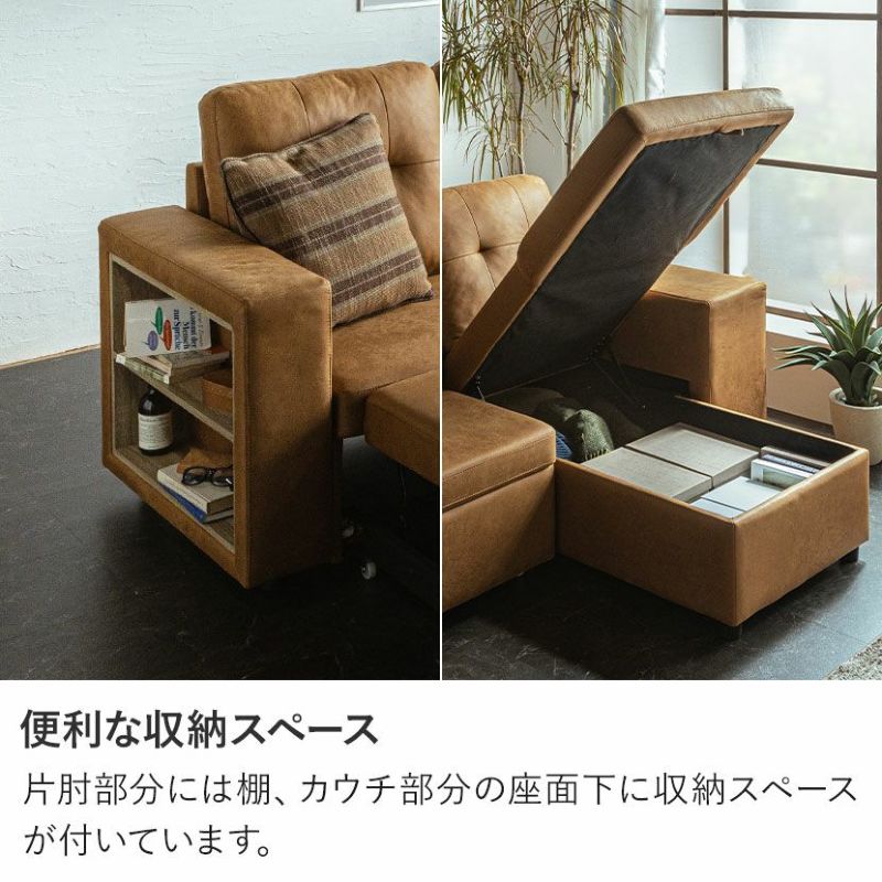 片肘部分に2段の棚、カウチ部分の座面下に収納スペースが付いています。