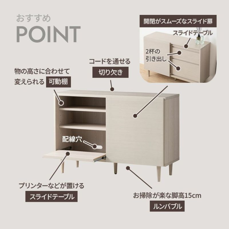 スライド扉内の最下段には、プリンターなどの収納に便利なスライドテーブルが付いています。