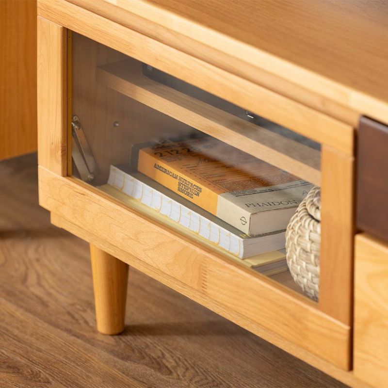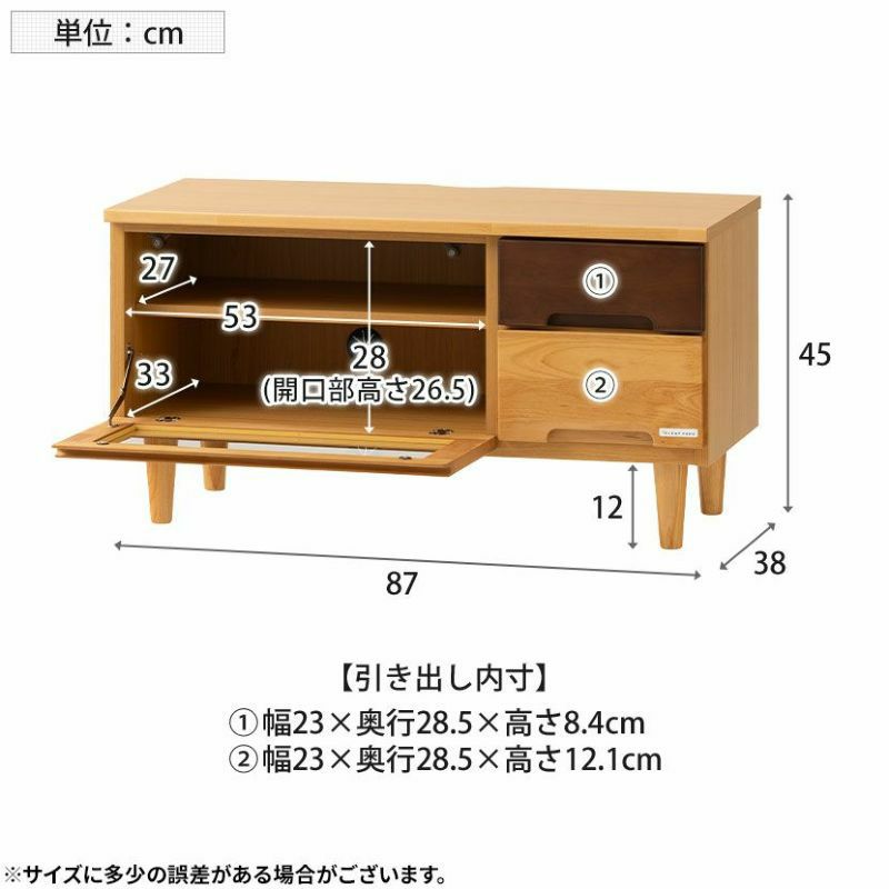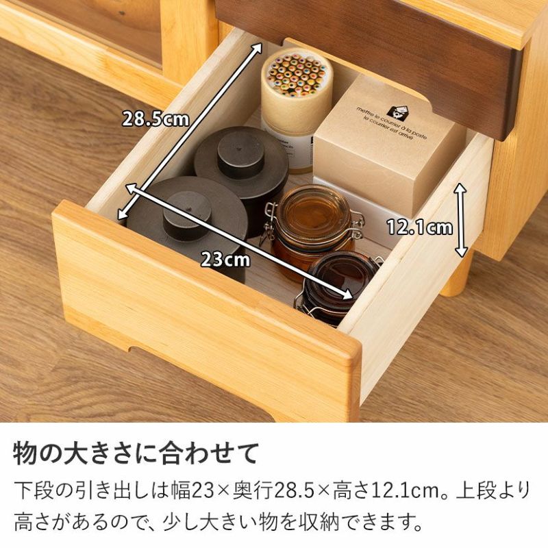 ※突板とは、板の表面にスライスした天然木を貼り付けたもの切り欠き加工天板にはコードがあっても壁にぴったりと付けられるよう、切り欠き加工が施されています。ガラスのフラップ扉ガラス部分の扉はフラップ扉になっています。フラップ扉の開閉は、必ず扉に手を添えてゆっくりと操作してください。AV機器はここにフラップ扉の中は3段階に調節できる可動棚付きの収納があります。コード配線もスムーズに中央のフラップ扉部分の背面には、コードの配線に便利な配線穴が空いています。小物の収納に上段の引き出しは幅23×奥行28.5×高さ84cm。テレビ周りの小物を収納するにはちょうどいいサイズ感です。物の大きさに合わせて下段の引き出しは幅23×奥行28.5×高さ12.1cm。上段より高さがあるので、少し大きい物を収納できます。扉を閉めたままで◎フラップ扉は閉めたままでもリモコン操作が可能。デッキ作動の度に、扉を開け閉めする手間が省けます。
