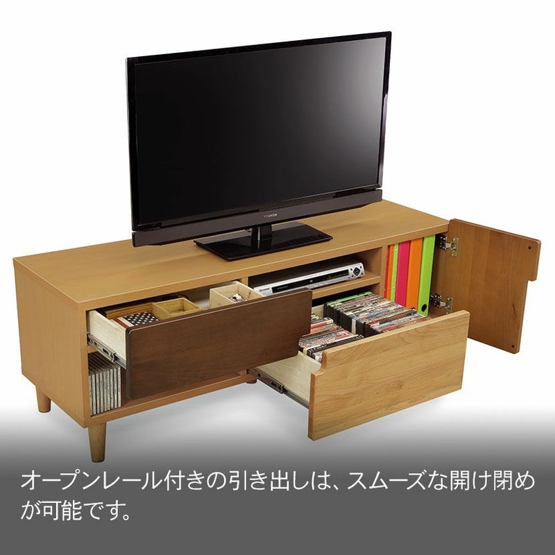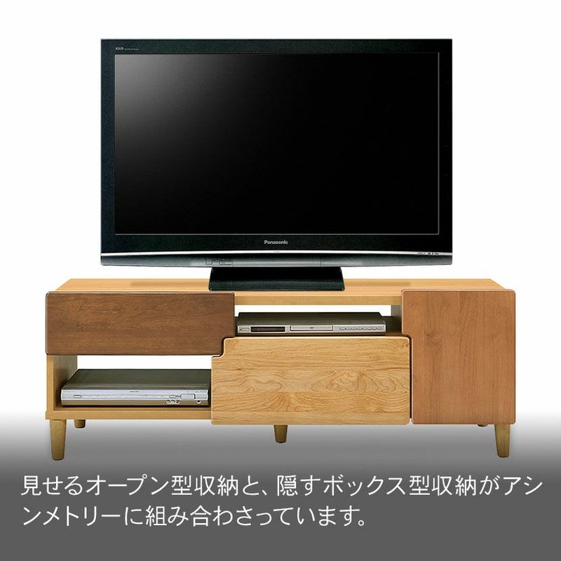 ●オープン型収納とボックス型収納がアシンメトリーに組み合わさっており、見せたい物をオープンスペースに、隠したい物を扉付きのボックス内に収納することができます。