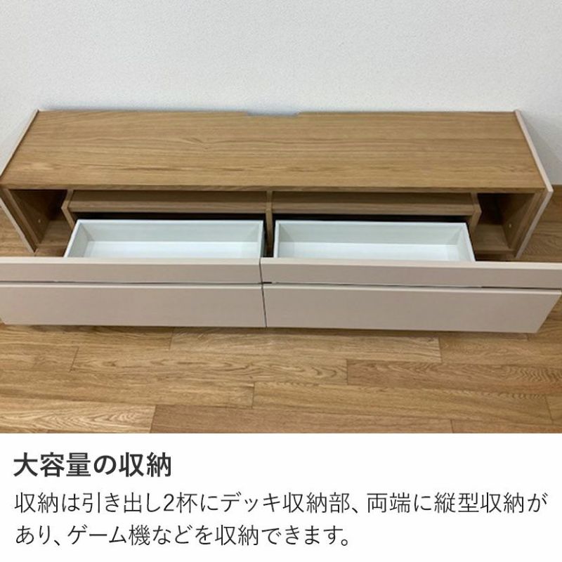収納は引き出し2杯にデッキ収納部、両端に縦型収納があり、ゲーム機などを収納できます。