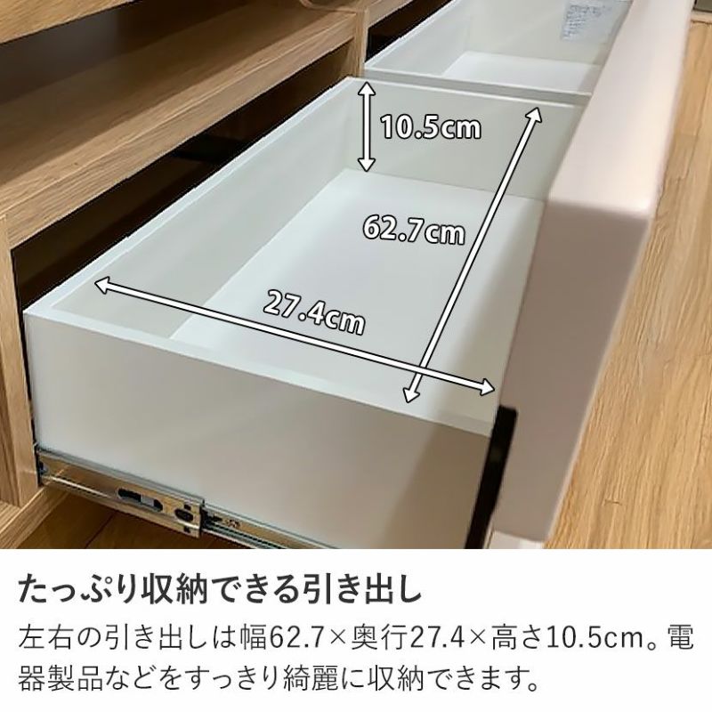 左右の引き出しは幅62.7×奥行27.4×高さ10.5cm。電器製品などをすっきり綺麗に収納できます。