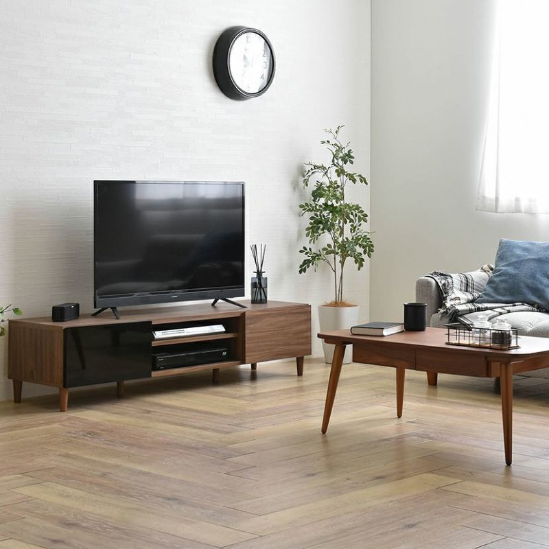 木目調と美しい鏡面のコンビネーションが特徴のテレビボード。