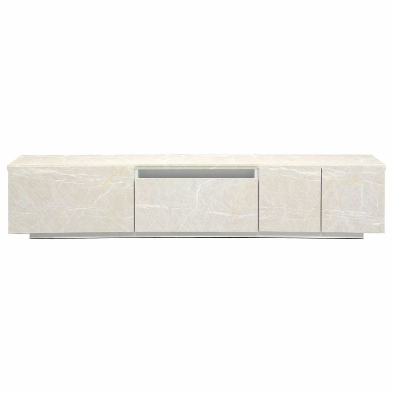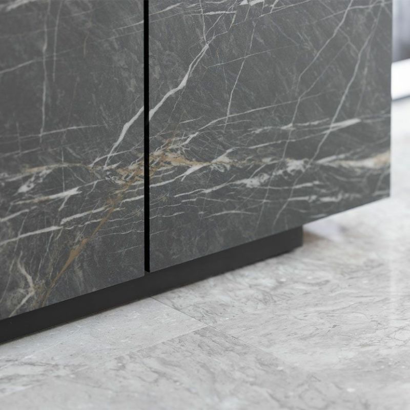 テレビボードには石目調のシートを使用。近くで見ても柄素材だと分からないほどリアルな素材感です。