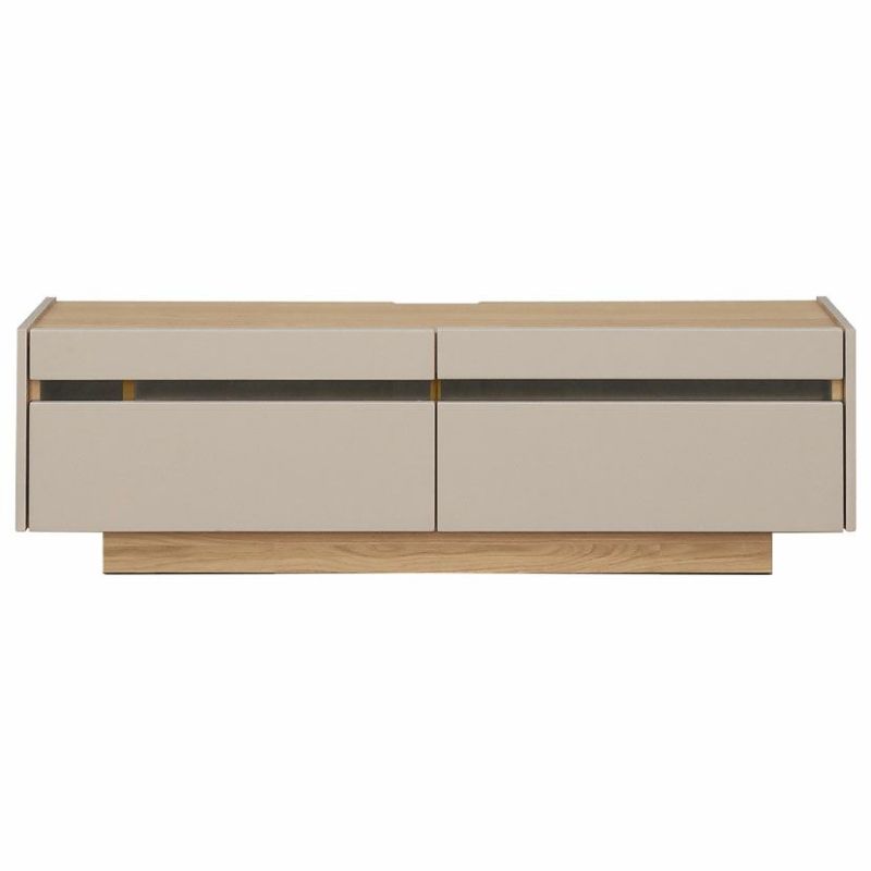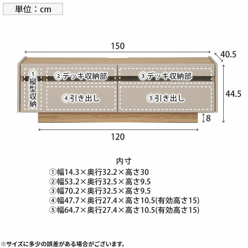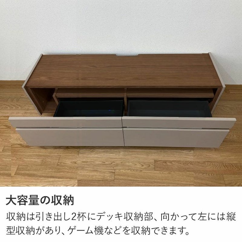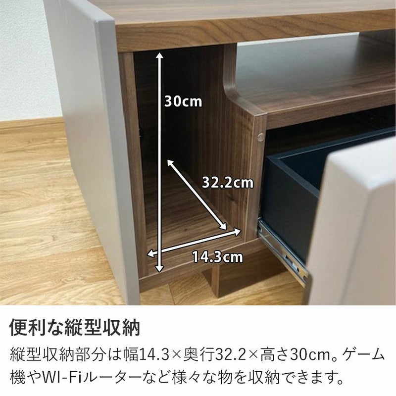 収納は引き出し2杯にデッキ収納部、向かって左には縦型収納があり、ゲーム機などを収納できます。