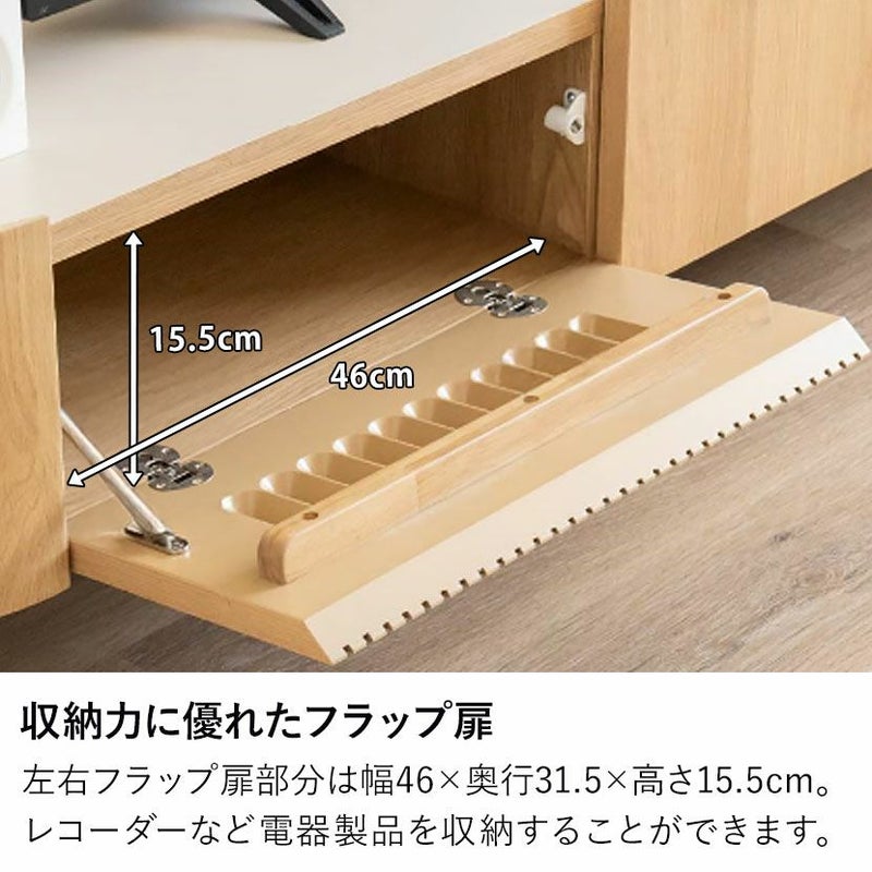 左右フラップ扉部分は幅46×奥行31.5×高さ15.5cm。レコーダーなど電器製品を収納することができます。