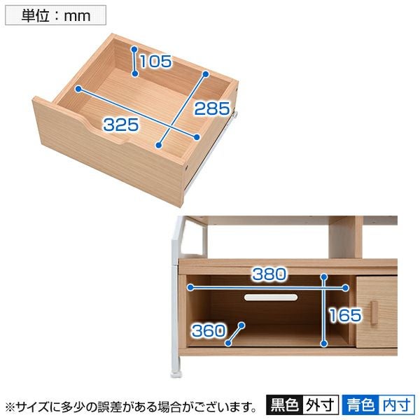 | 耐荷重(約) | 天板 / 20kg以下 下台天板 / 40kg以下 オープン部左右 / 5kg以下 引き戸 / 10kg以下 引き出し / 7kg以下 |