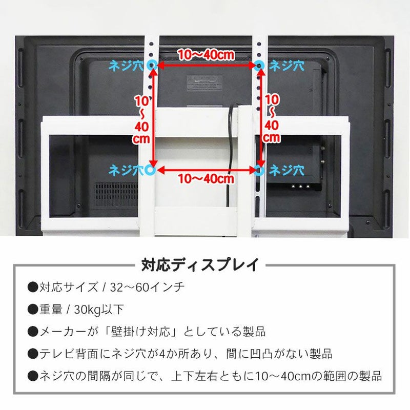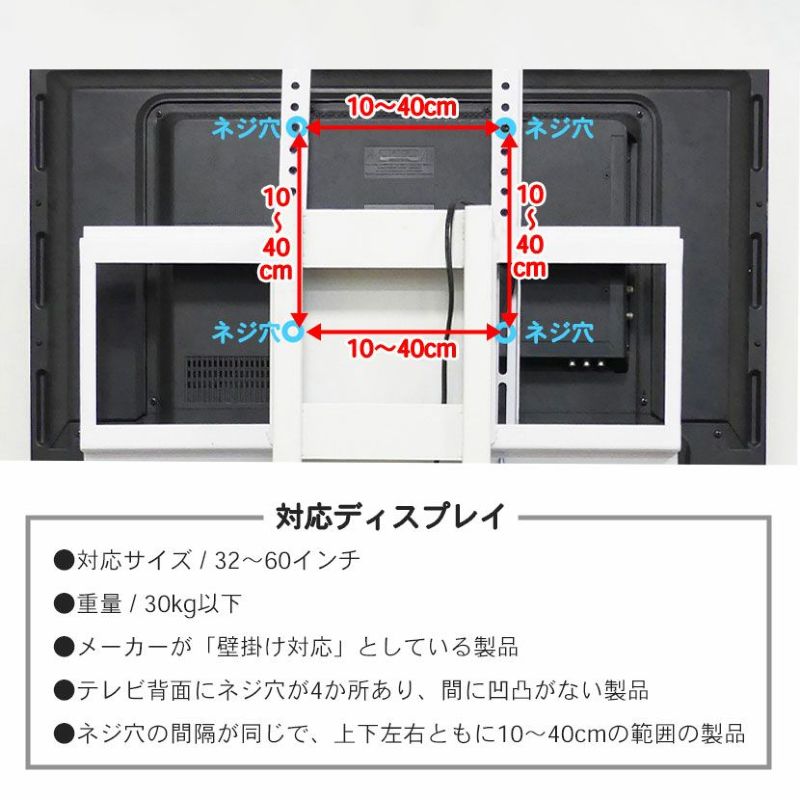 | 対応ディスプレイ | 対応サイズ / 32~60インチ 重量 / 30kg以下 ・メーカーが「壁掛け対応」としている製品 ・テレビ背面にネジ穴が4か所あり、間に凹凸がない製品 ・ネジ穴の間隔が同じで、上下左右ともに10~40cmの範囲の製品 |