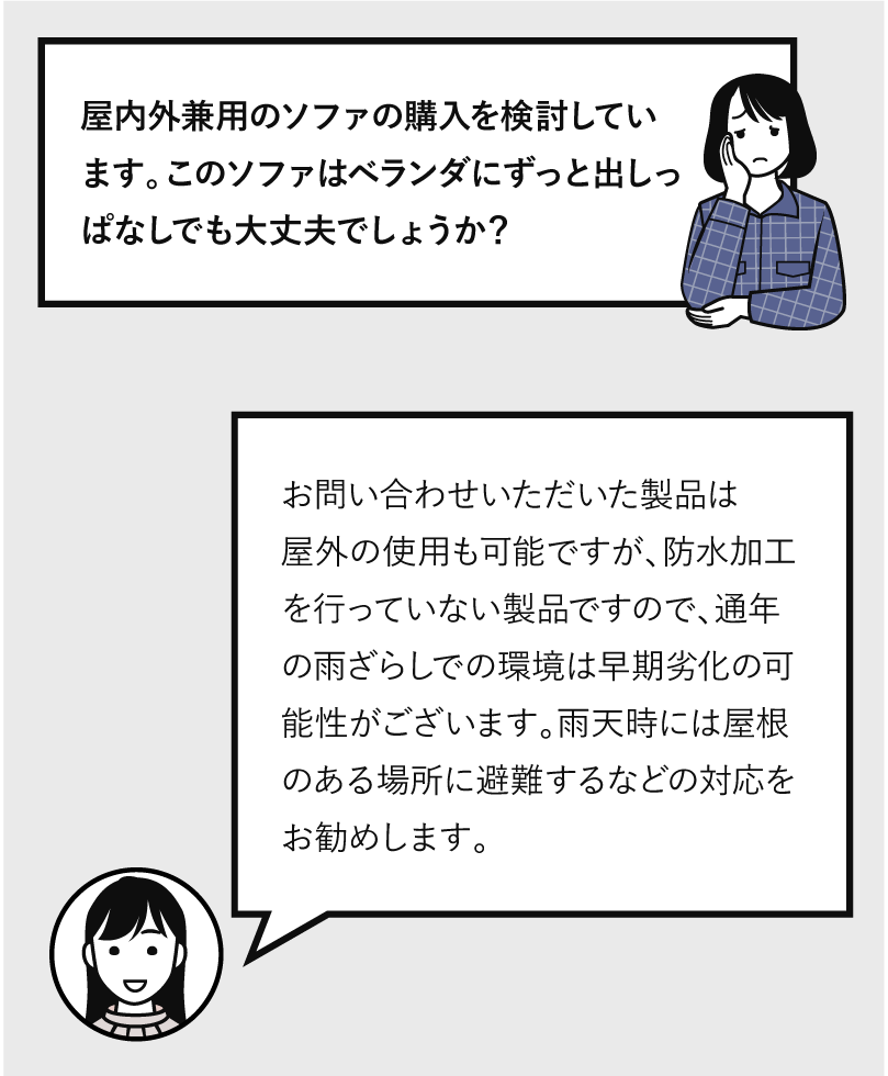 インテリアやコーディネートのご相談はもちろん、家具の材質についての質問や、購入した家具のお手入れ方法など、相談事例は多岐に渡ります。