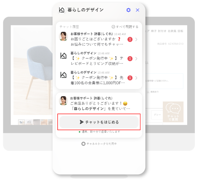 チャット画面が立ち上がりますので、「チャットをはじめる」という部分をクリックしてください。