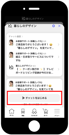 暮らしのデザインのサイトの右下にある、「チャットで質問」と書いてあるマークをタップしてください。