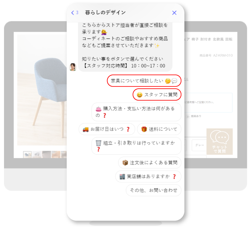 「家具について相談したい」「スタッフに質問」の項目を選ぶと、直接スタッフに相談することができます。