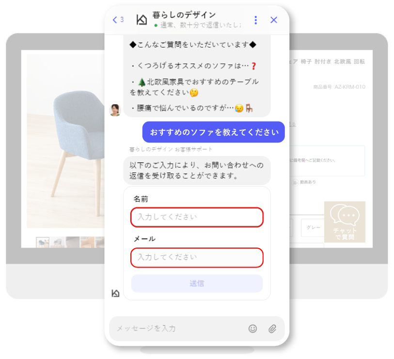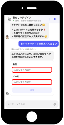 相談内容を送信後、名前とメールアドレスを入力することでサイトを離れてもスタッフからの返信をメールで受け取り、そのままチャットを再開することができます。