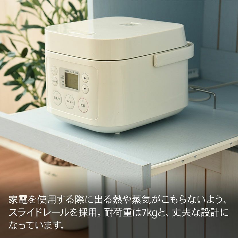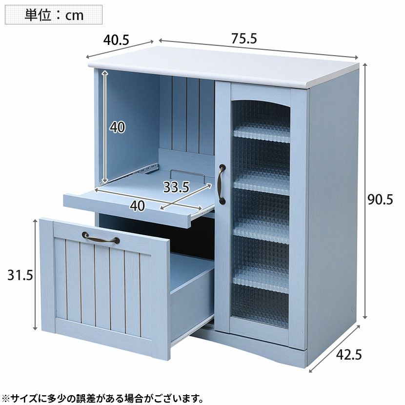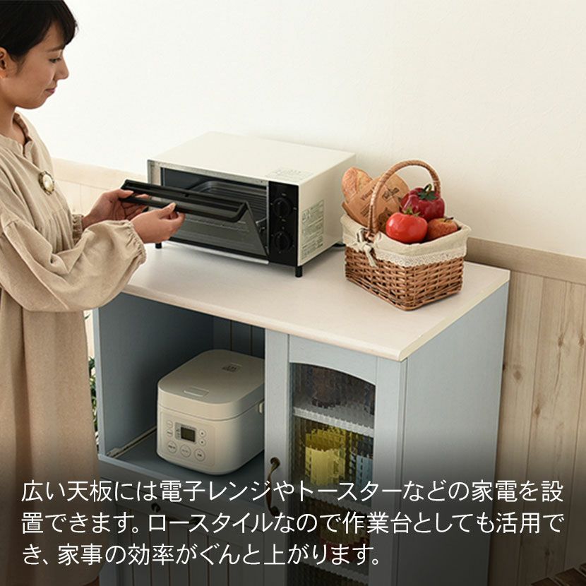 他の画像を見る 幅75.5cm 木製 キッチンカウンター ガラス扉 スライド棚付き コンセント付き コンパクト 食器棚 キッチン収納 レンジ台 フレンチカントリー かわいい ブルー 送料無料 送料無料 ¥ 21,990 税込 カートに入れる